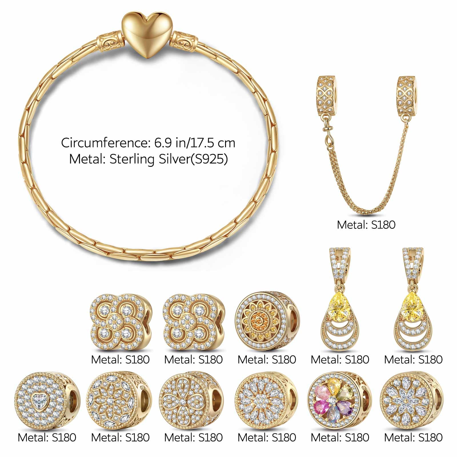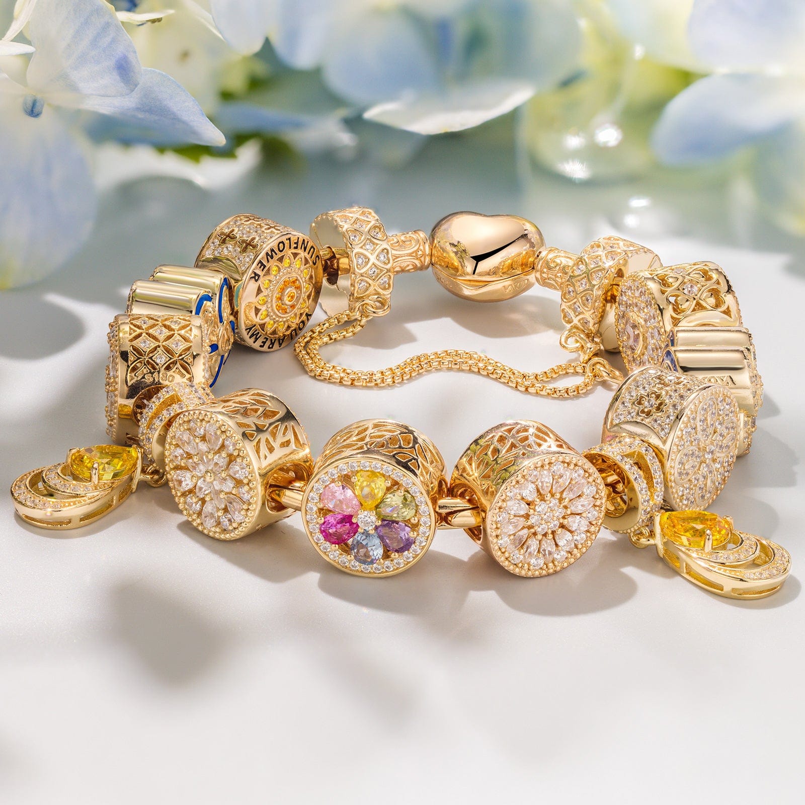 Sterling Silver Blooming Petals of Love Charms Bracelet Set In 14K Gold Plated