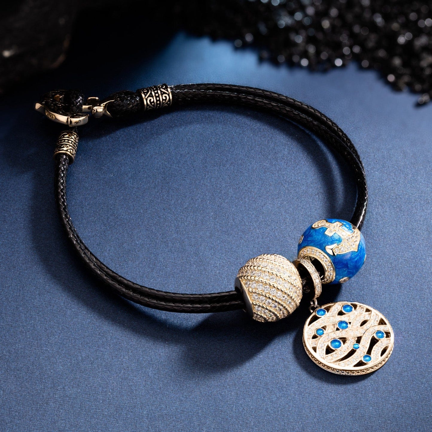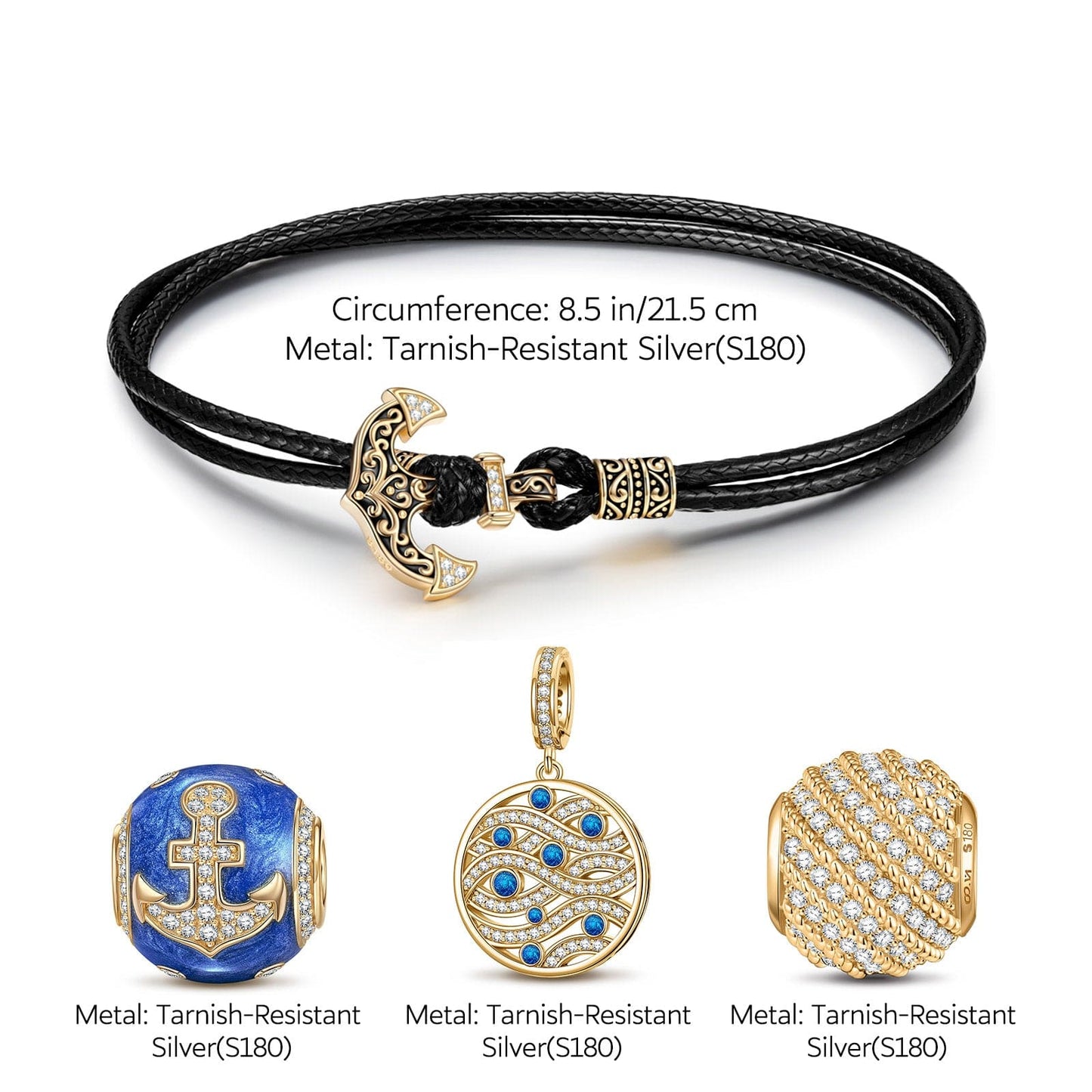 Waves And Anchors Tarnish-resistant Silver Leather Charms Bracelet Set With Enamel In 14K Gold Plated