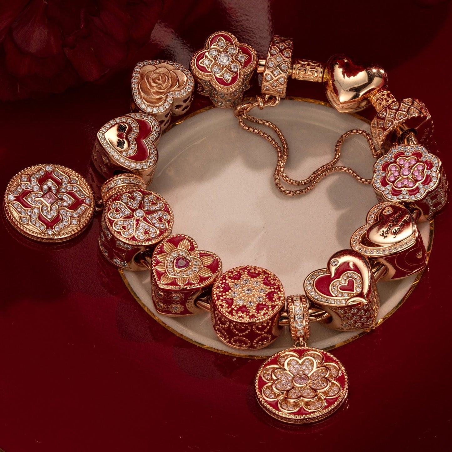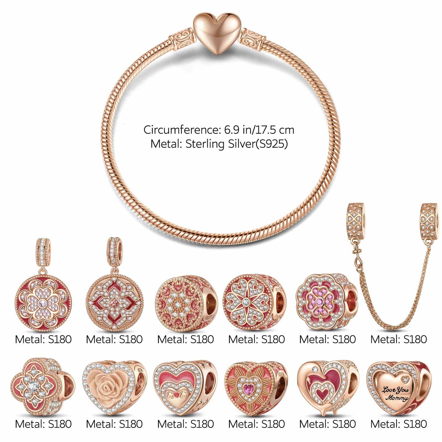 Sterling Silver Cherished Memories Charms Bracelet Set With Enamel In Rose Gold Plated
