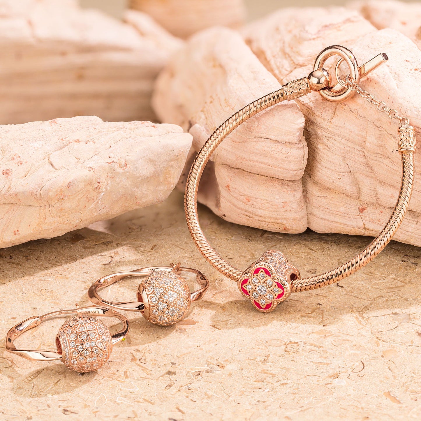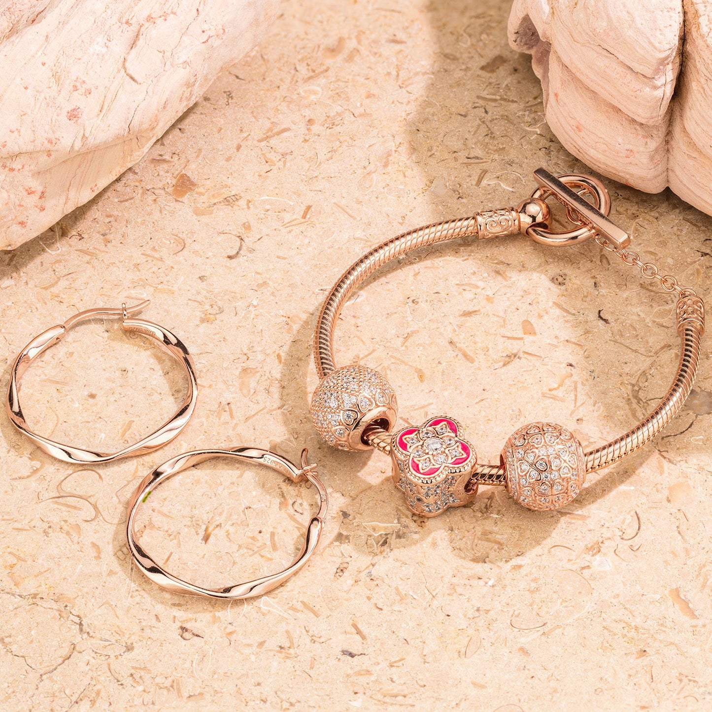 Rose Heart Tarnish-resistant Silver Charms Bracelet and Earrings Set With Enamel In Rose Gold Plated