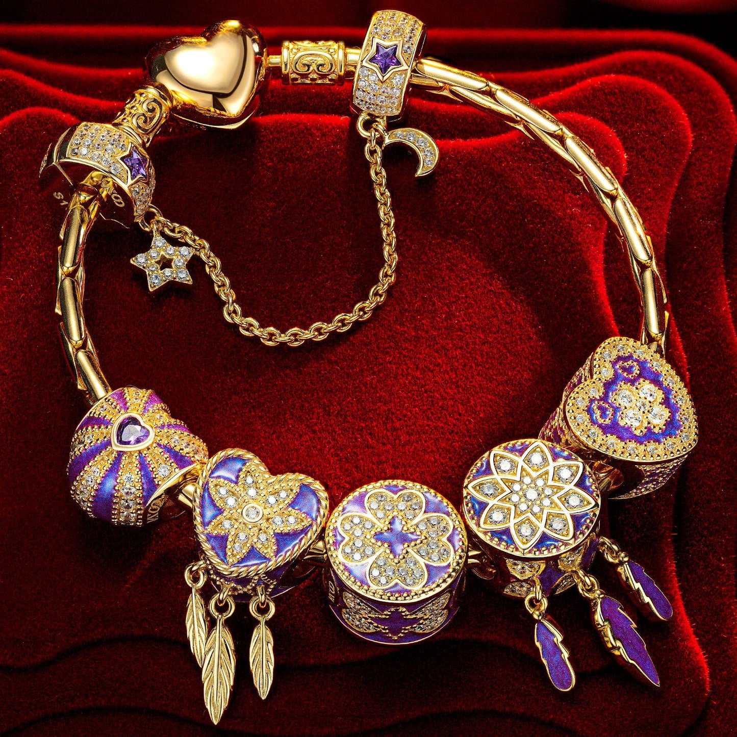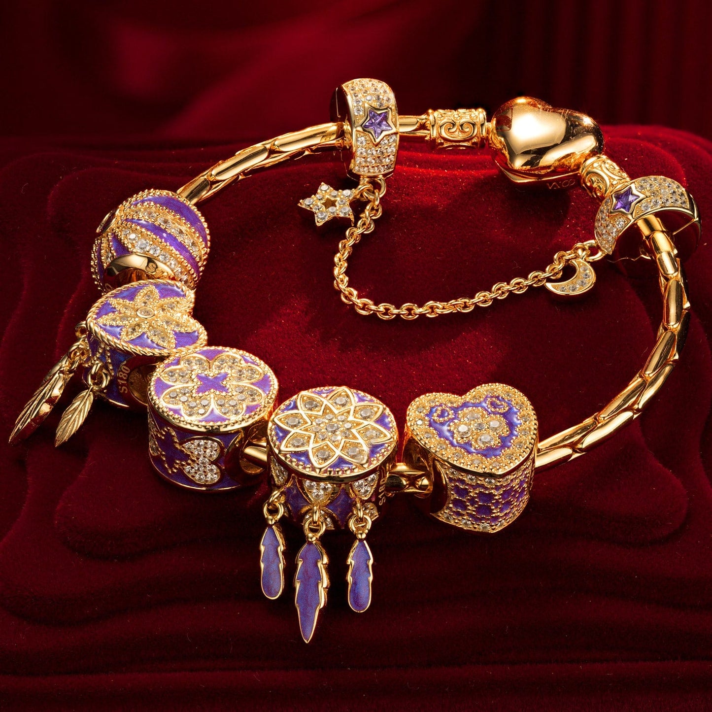 Sterling Silver Romantic Whispers Charms Bracelet Set With Enamel In 14K Gold Plated