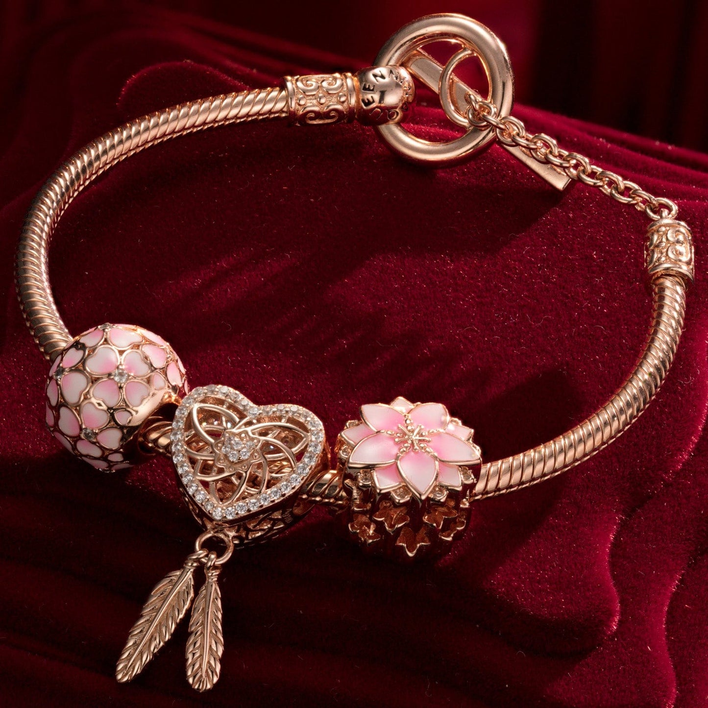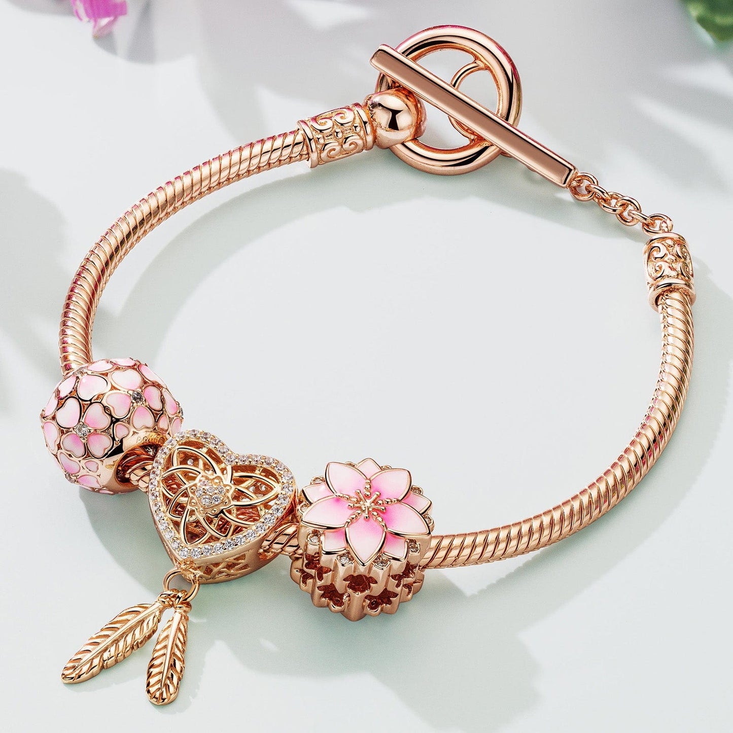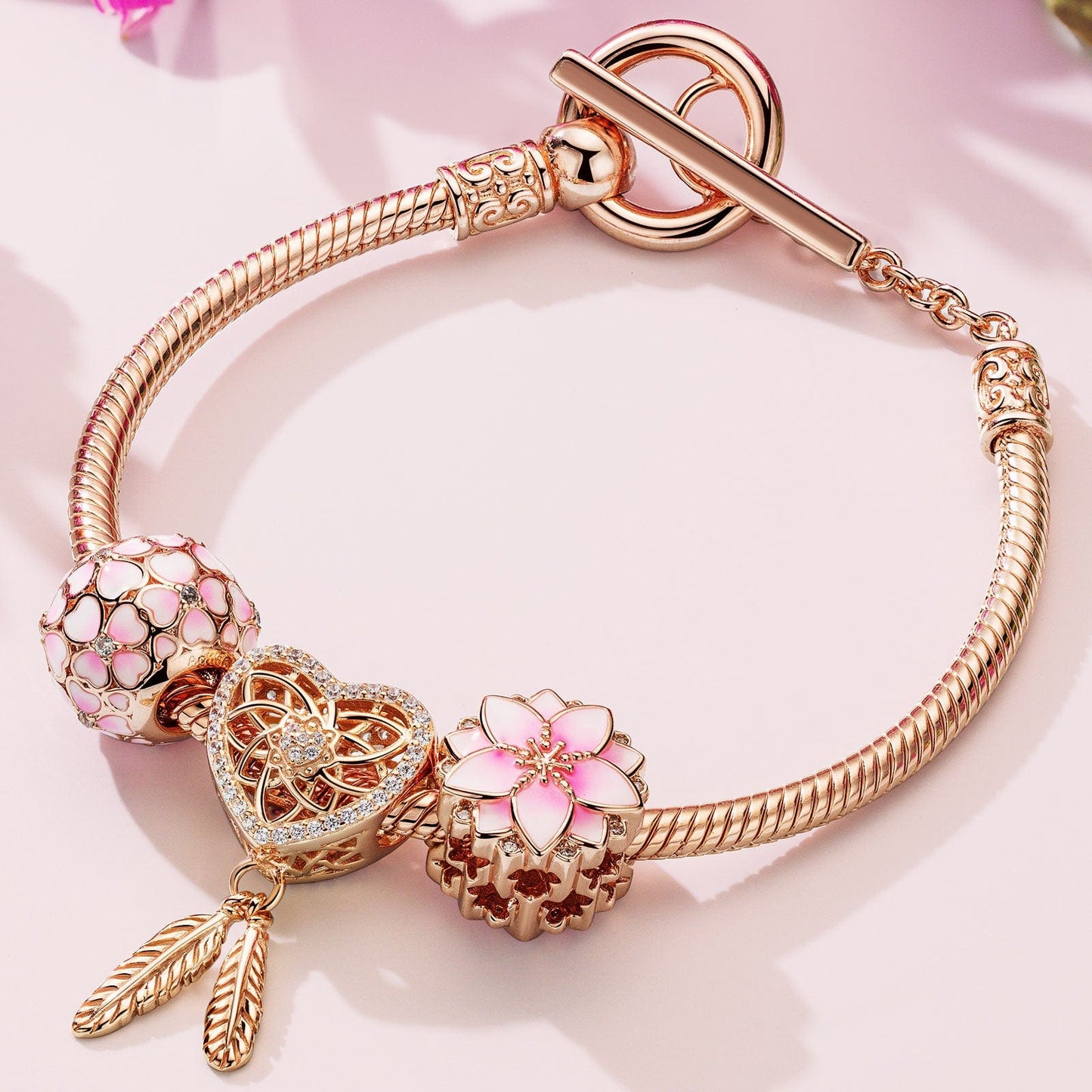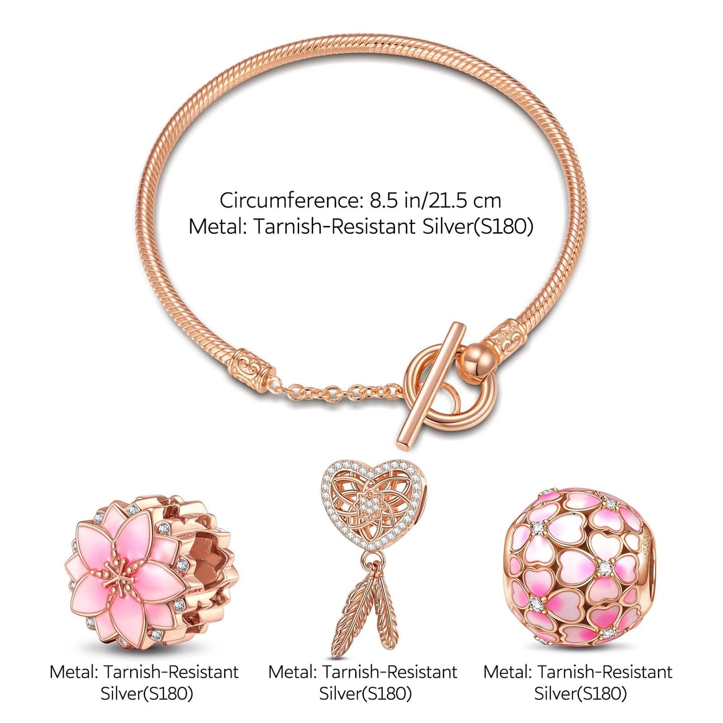 Pink Lovers Tarnish-resistant Silver Charms Bracelet Set With Enamel In Rose Gold Plated
