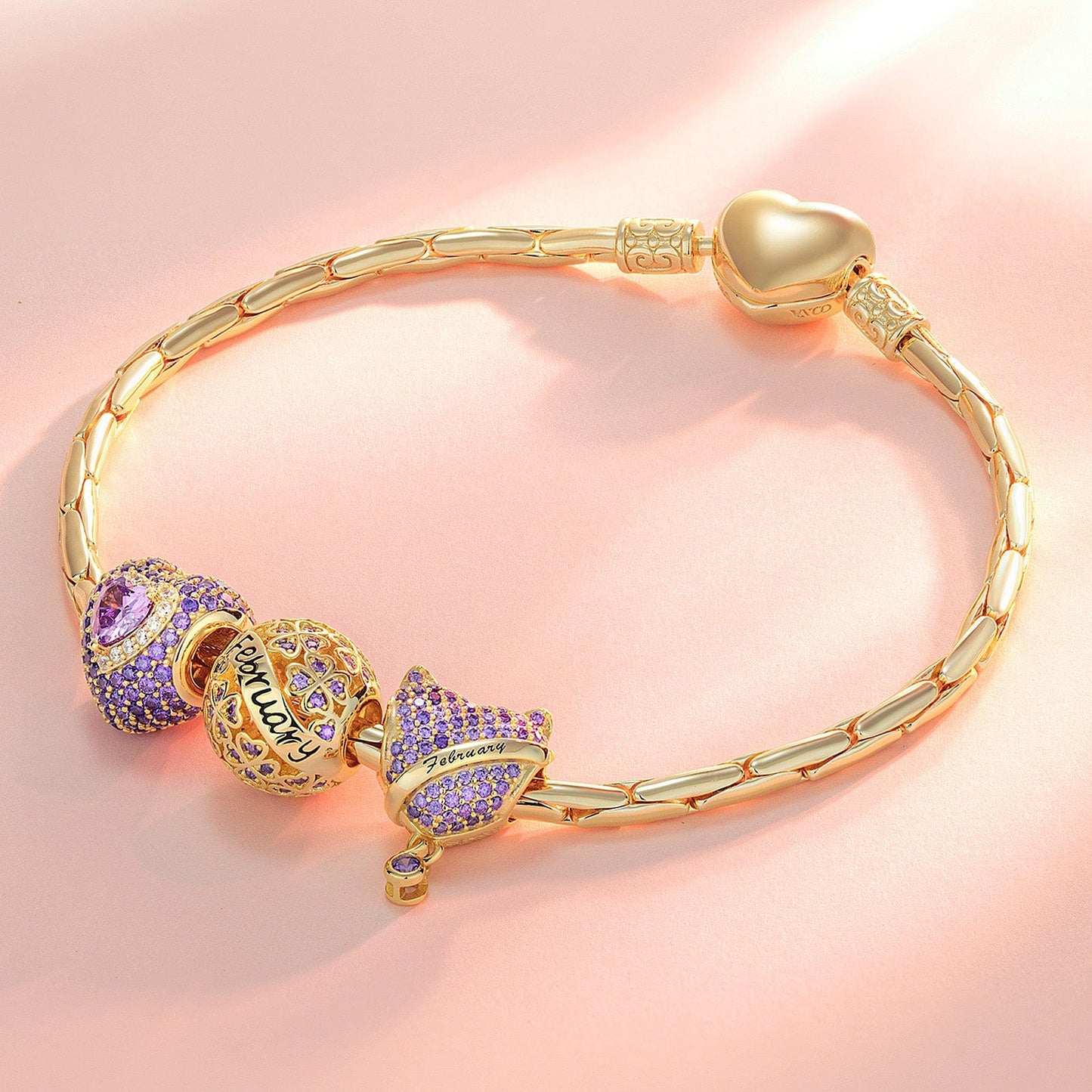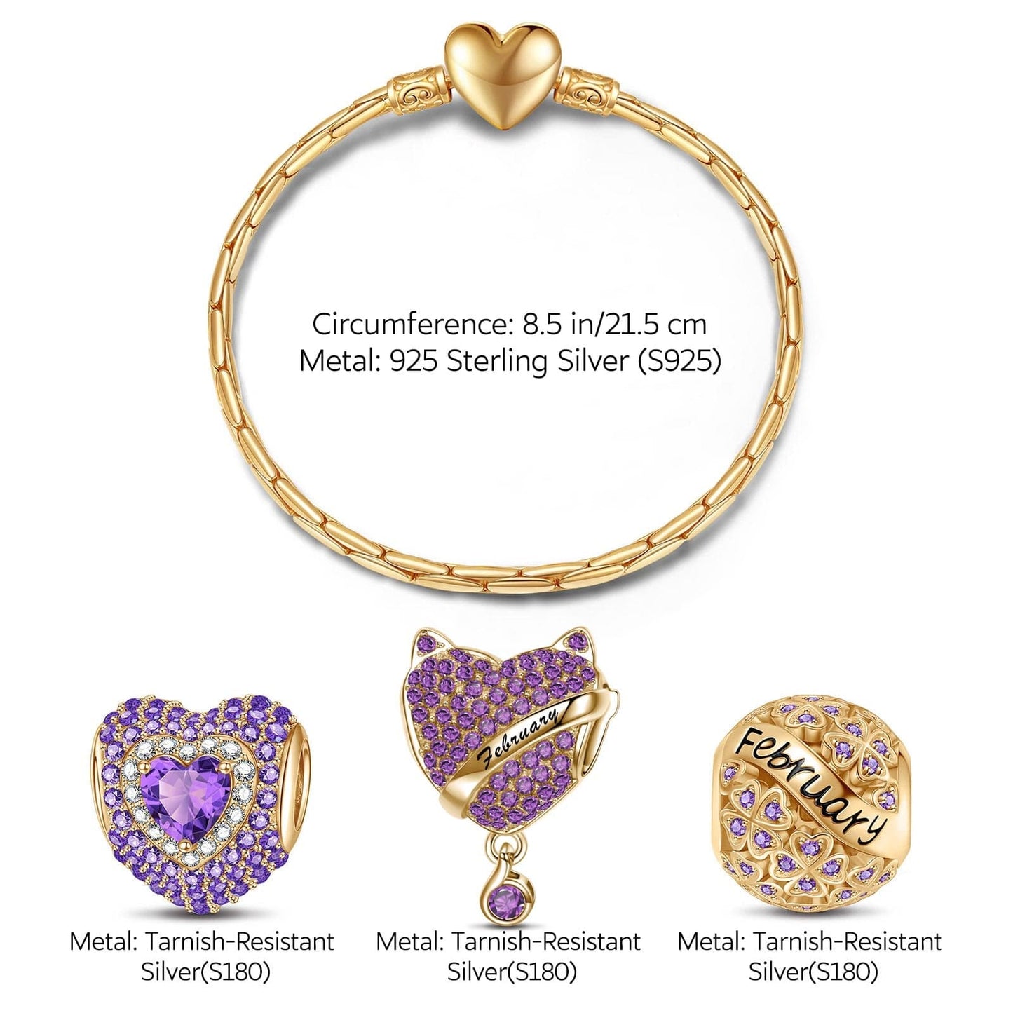 Sterling Silver February Birthday Stone Charms Bracelet Set In 14K Gold Plated