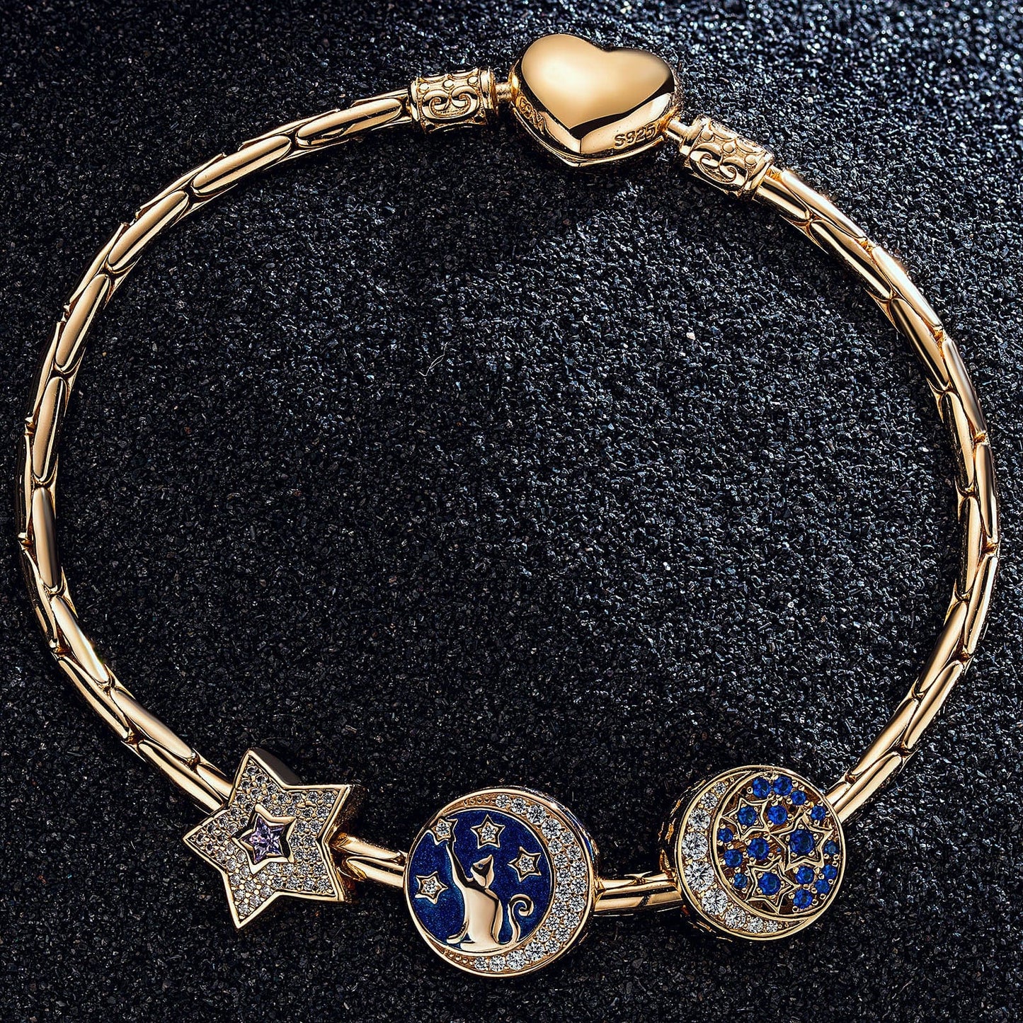 Sterling Silver Cat and the Stars Bamboo Chain Charms Bracelet Set With Enamel In 14K Gold Plated