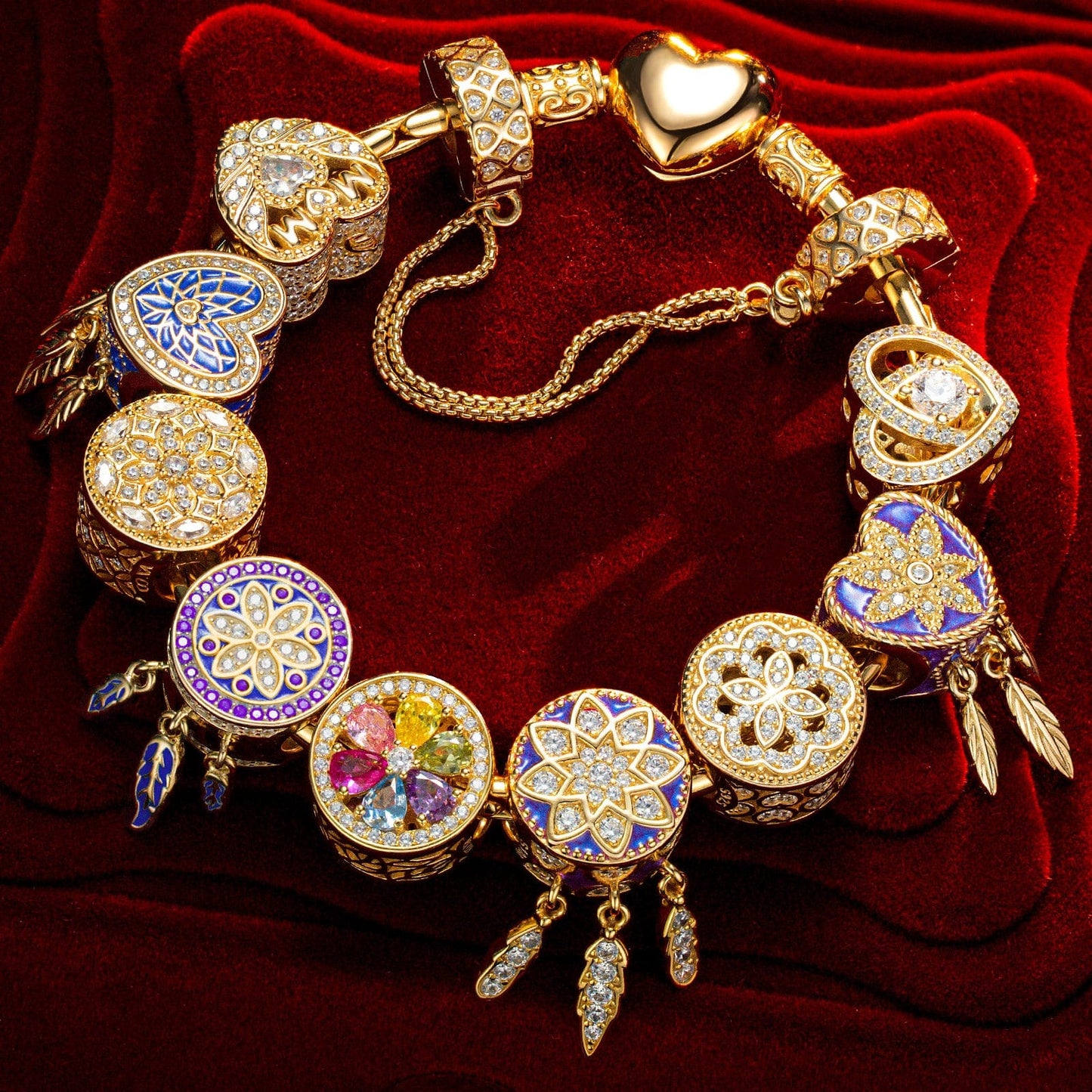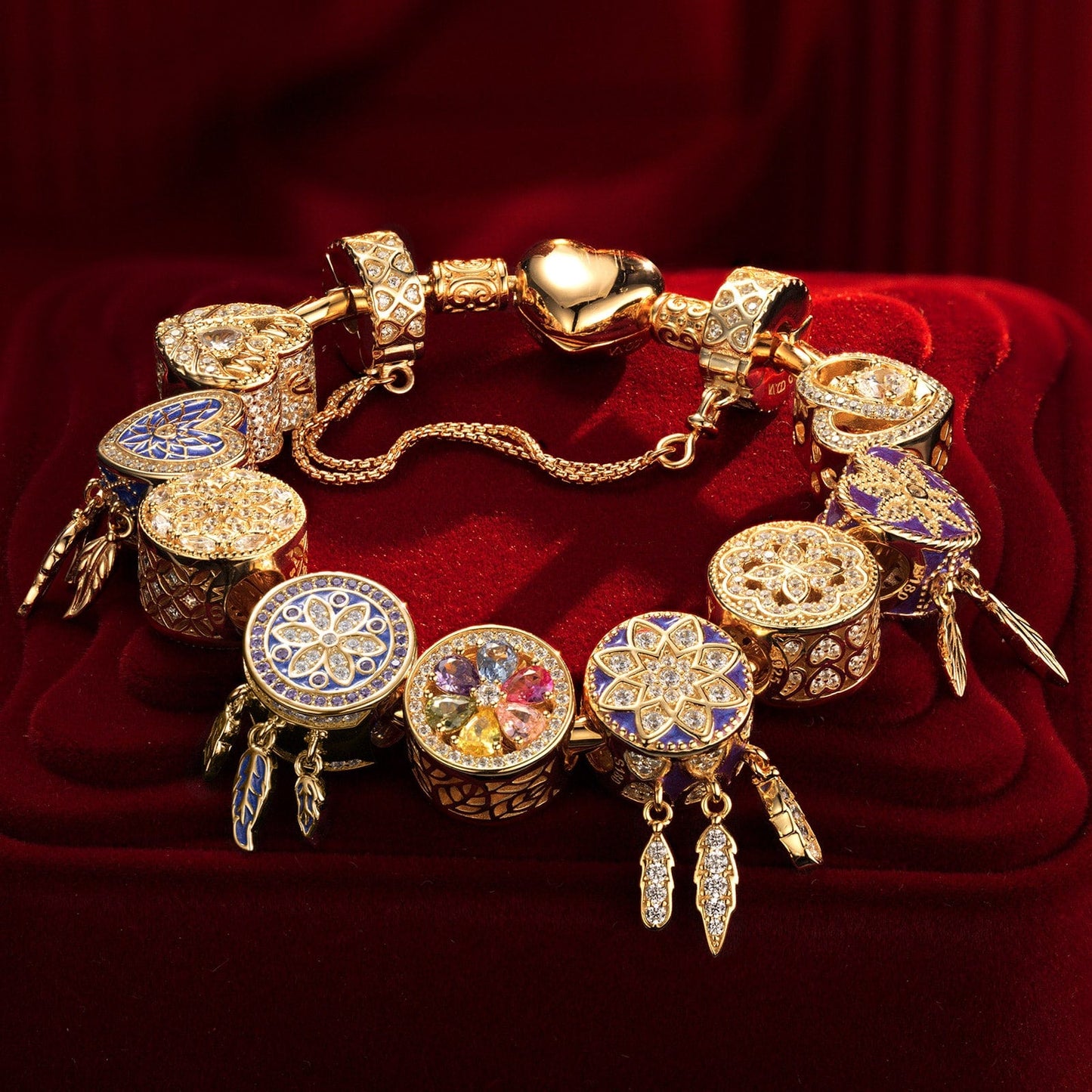 Sterling Silver Lavish Romance Charms Bracelet Set With Enamel In 14K Gold Plated