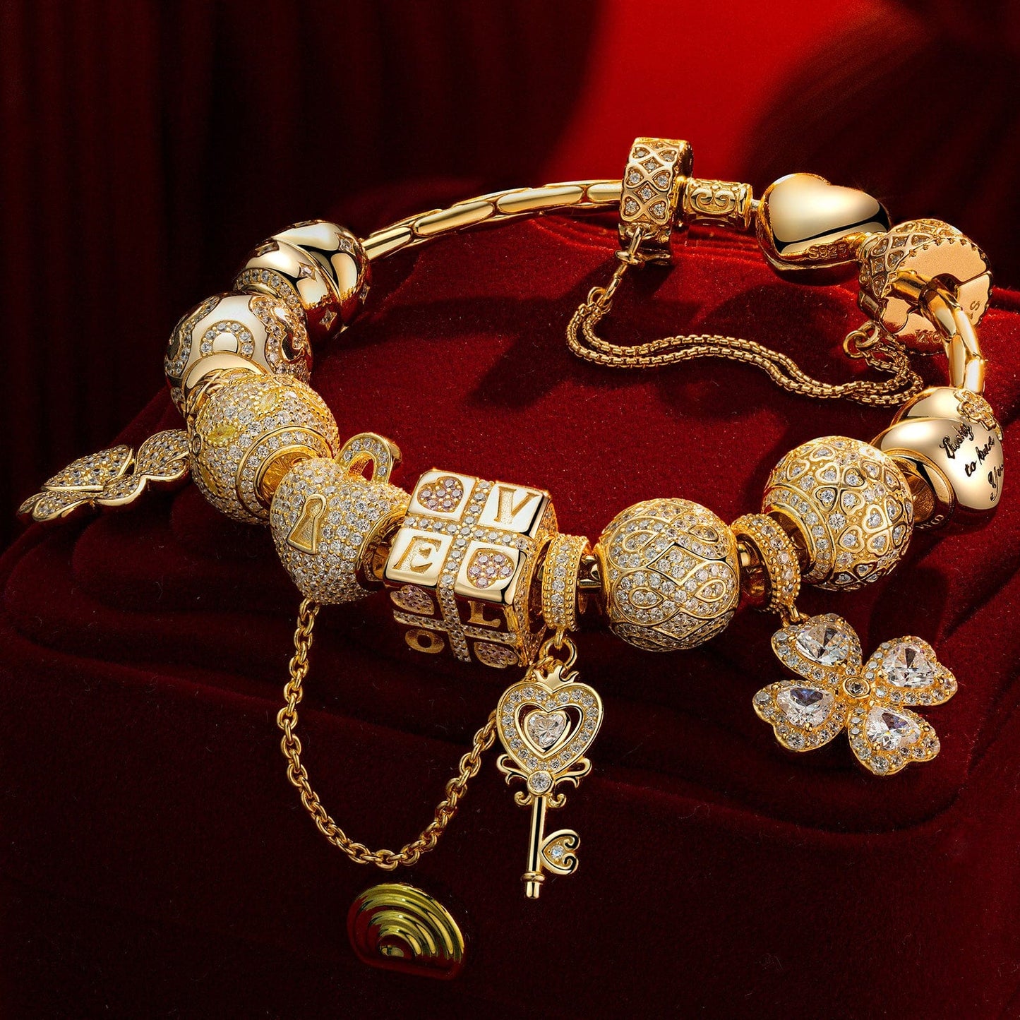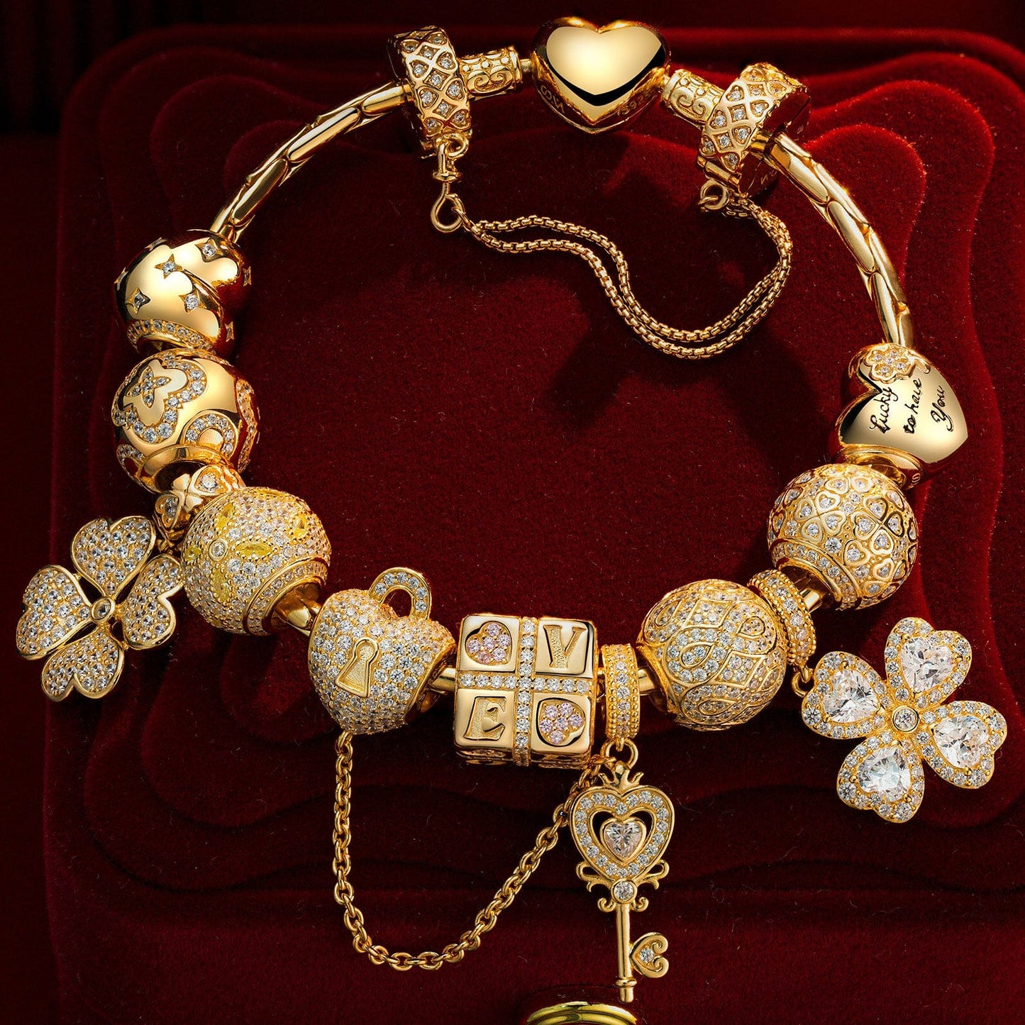 Sterling Silver May Love Luck and Happiness Charms Bracelet Set In 14K Gold Plated