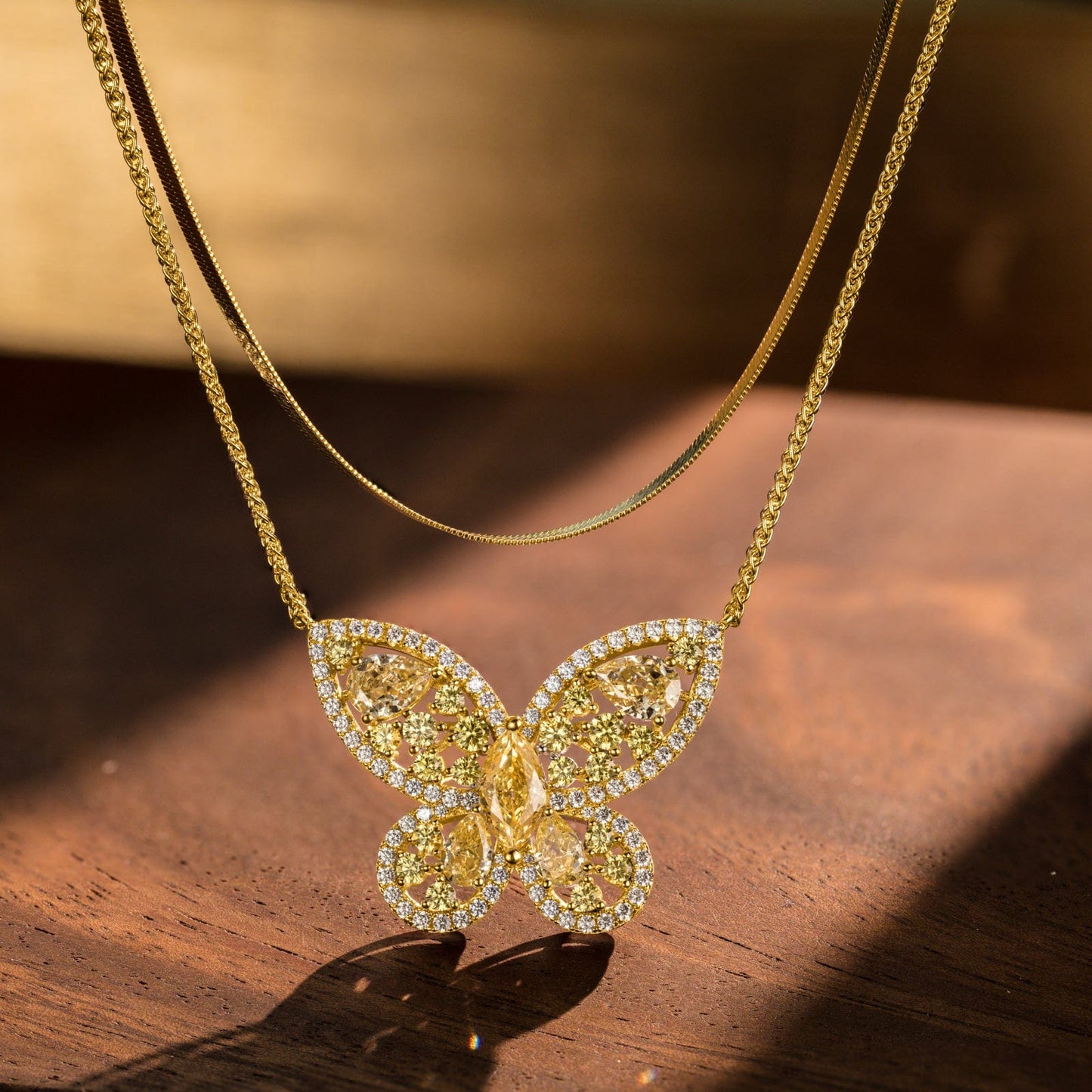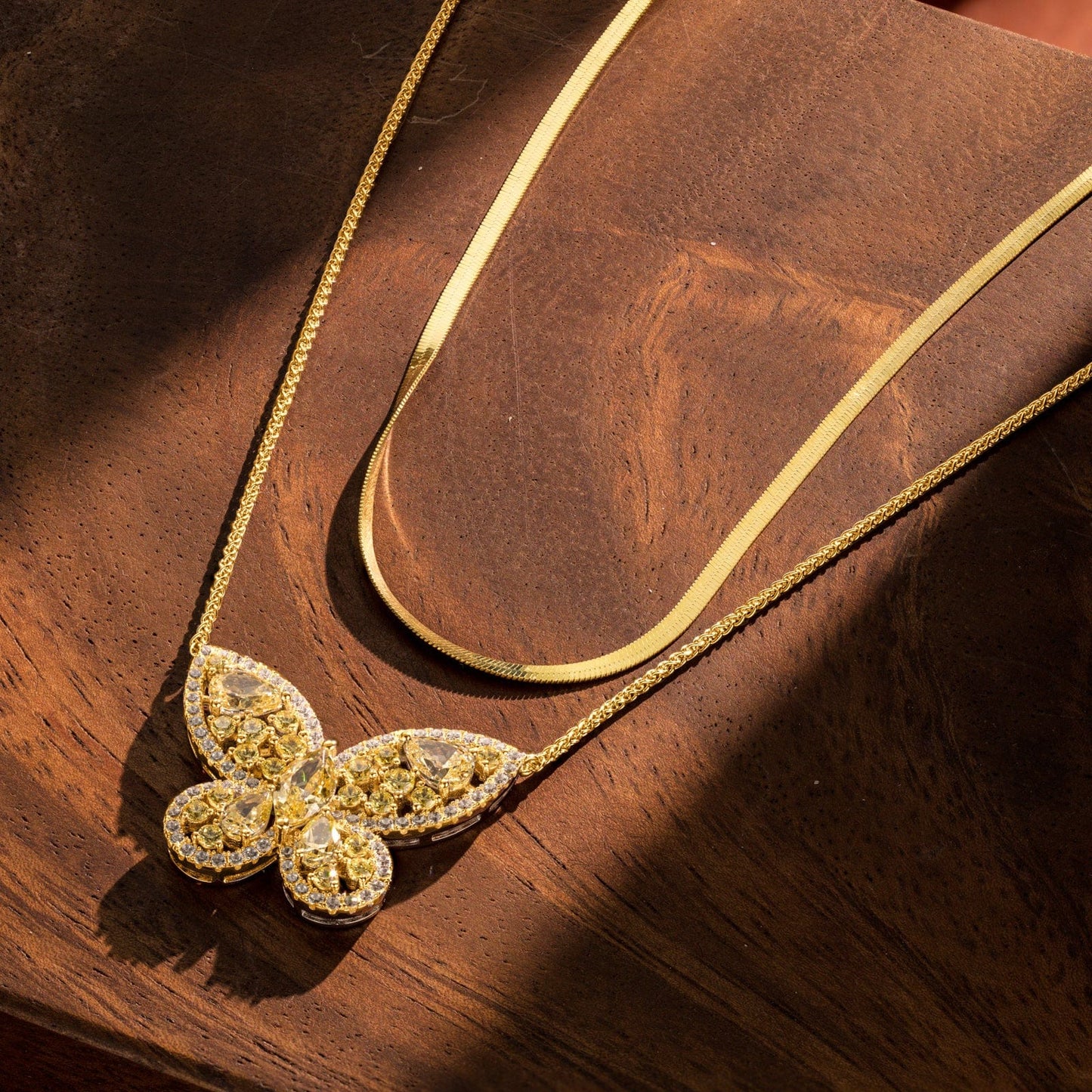 Sterling Silver Layered Necklaces Set: Flat Snake Chain and Butterfly Pendant Necklace Set In 14K Gold Plated
