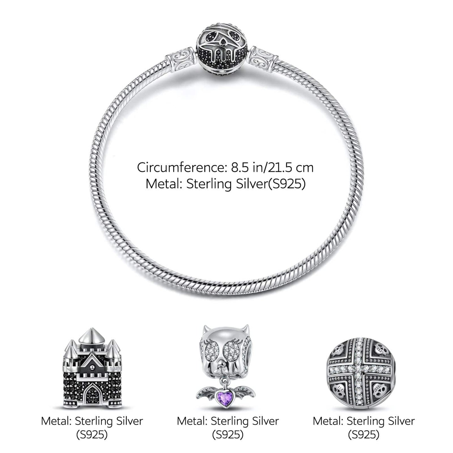 Sterling Silver Elf Castle Charms Bracelet Set With Enamel In White Gold Plated